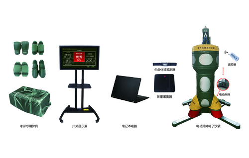 格斗培训与智能考评系统通过电子沙袋(菇型)配套使用,用于单兵格斗培训与考核;具有击打力度、击打次数采集功能;可设定有效击打力度值、考核时间,可区分和统计每次规 定有效时间内最大、有效击打力度值,可完成对直拳、摆拳、勾拳、弹 踢、横踢、正蹬、侧踹、横击肘、正顶膝9个动作的考核;根据导入的人员名单和大纲评定标准对考核人员的成绩进行测评,并可查看历史成绩,支持成绩数据导出及打印,为部队格斗术基础培训考核提供公正、准确的数据。
